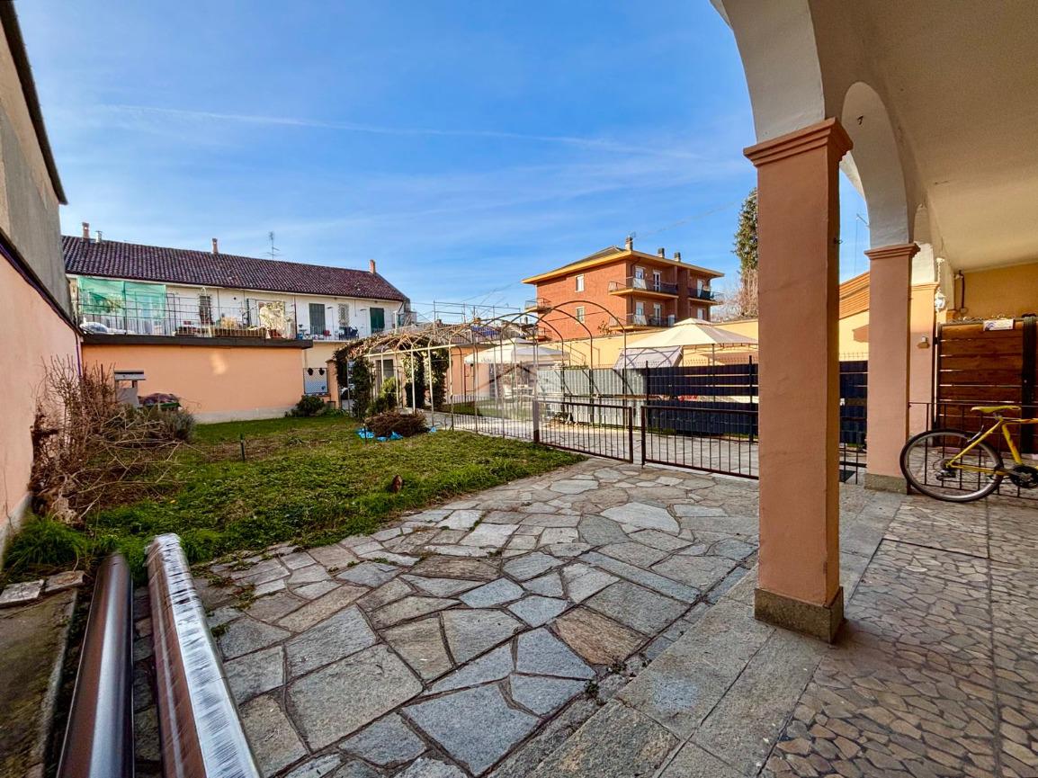 In contesto d’epoca nel cuore del paese, appartamento al piano terra che unisce il carattere storico alla comodità degli spazi esterni privati. L’ingresso si apre direttamente su un luminoso soggiorno living con cucina a vista, un ambiente accogliente e ben organizzato che affaccia sul cortile interno, in parte pavimentato e in parte adibito a giardino piantumato, ideale per momenti di relax all’aperto o per pranzi e cene nella bella stagione. La zona notte è composta da una camera matrimoniale dalle dimensioni particolarmente generose, tale da consentire con facilità la realizzazione di una seconda cameretta o di uno studio, rendendo l’immobile estremamente versatile. Il bagno è annesso alla camera e completa la proprietà l’accesso diretto a un secondo giardino sul retro della casa, riservato e silenzioso, perfetto come spazio verde privato. L’appartamento è dotato di infissi in alluminio con doppio vetro, riscaldamento autonomo e si distingue per l’assenza di spese condominiali, rappresentando una soluzione ideale per chi cerca indipendenza, comfort e la comodità del centro senza rinunciare a spazi esterni esclusivi.