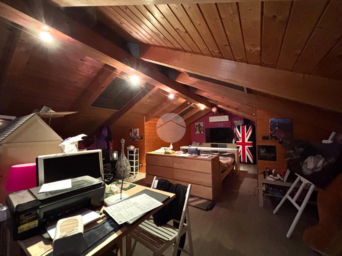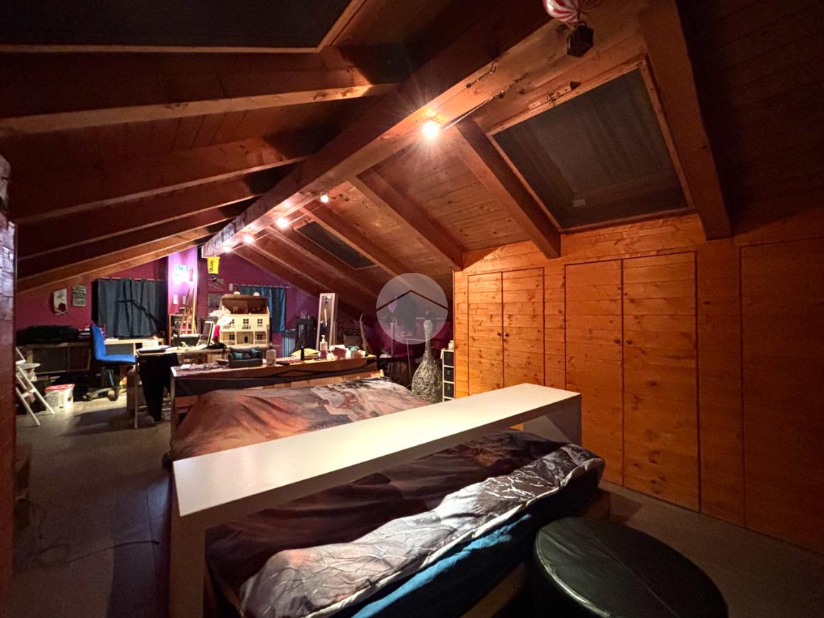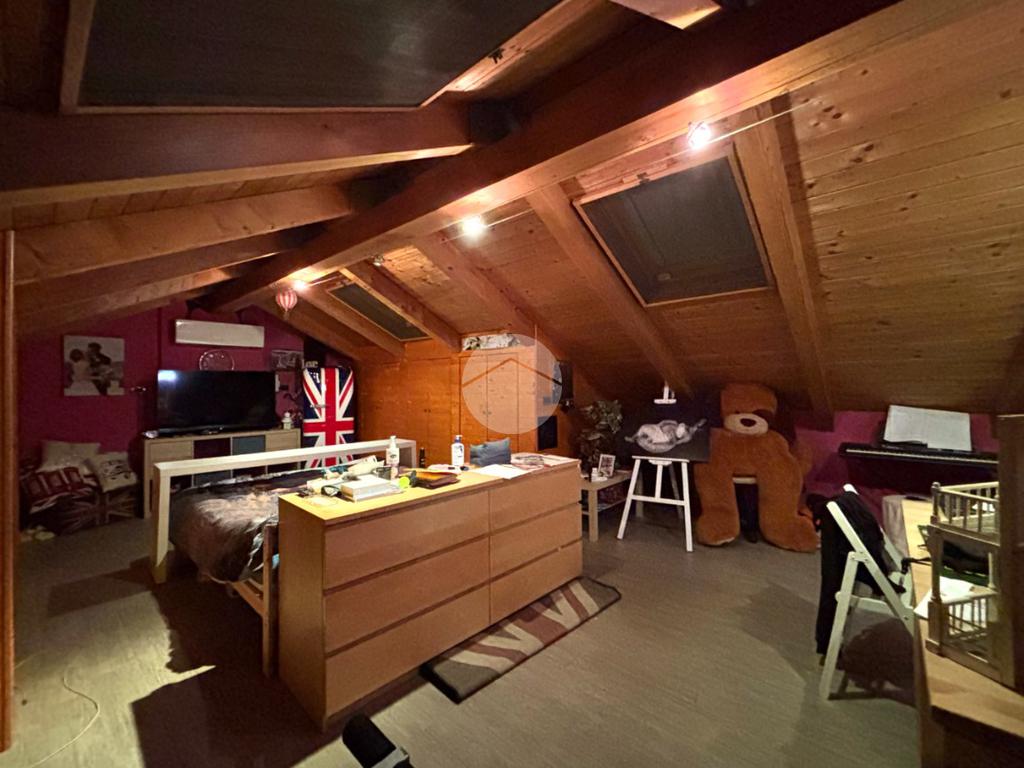 Al piano superiore si sviluppa la zona notte con due camere matrimoniali, una delle quali affacciata su un terrazzo con splendida vista sulle montagne. Il bagno del piano è particolarmente spazioso e completo di vasca, mentre il disimpegno è stato organizzato come pratica lavanderia con una comoda struttura in muratura dedicata alla stiratura. Una scala a chiocciola conduce al sottotetto, attualmente utilizzato come terza camera da letto, arricchito da una profonda intercapedine ideale come cabina armadi.