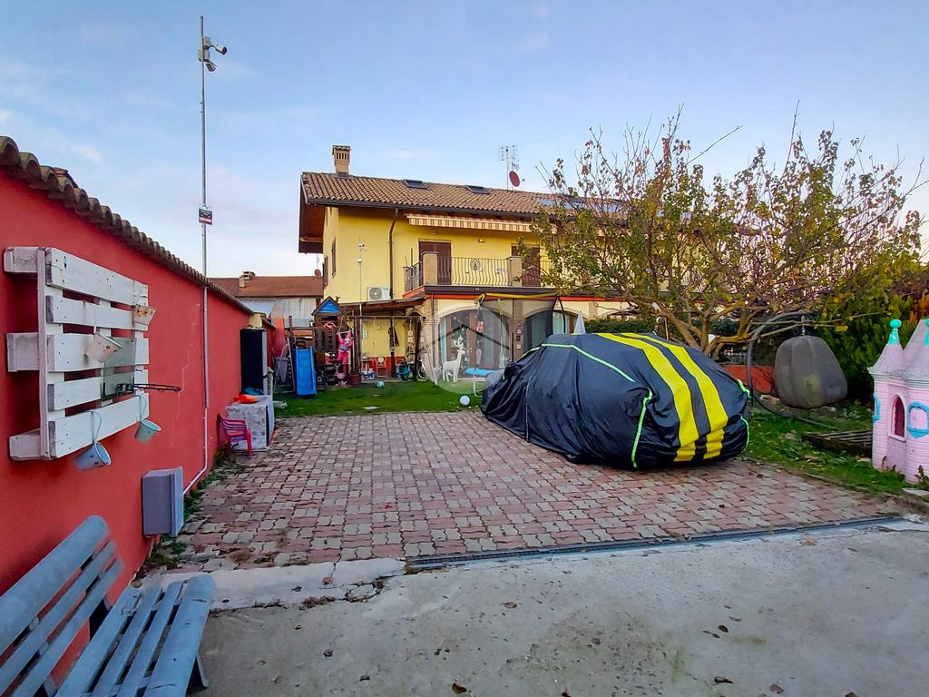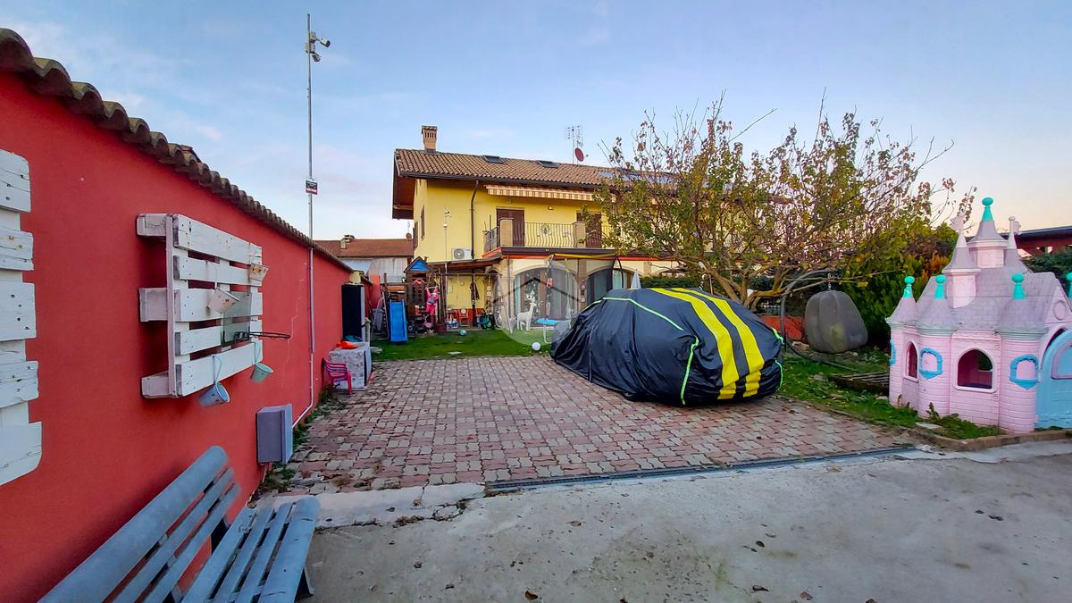 Il cortile esterno si presenta per metà pavimentato, perfetto per il parcheggio delle auto, e per metà piantumato. Sul retro dell’abitazione è inoltre presente un prefabbricato funzionale, attualmente adibito a cantina.